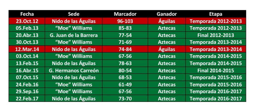 Asimismo, los enfrentamientos contra los Tigres Blancos de la Universidad Madero, los Borregos del ITESM campus Puebla o frente los Halcones de la Universidad Interamericana, no tienen el mismo atractivo para los aficionados; debido a la comparación de trayectoria histórica de los títulos y la diferencia en la duela de los Aztecas y las Águilas a comparación del resto.