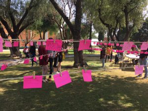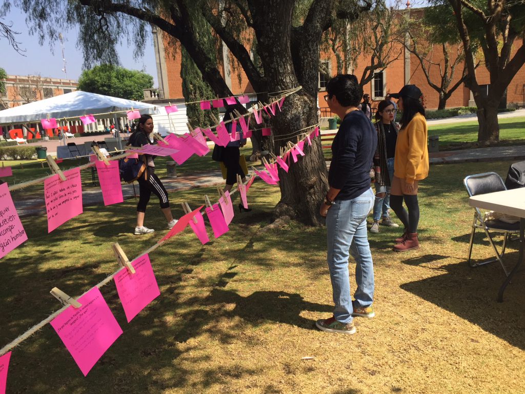 En esta actividad se invitó a la comunidad UDLAP a compartir sus experiencias con violencia, la inseguridad, la identidad y el acoso utilizando un soporte que alude a una actividad cotidiana, tradicionalmente femenina. La actividad consistió en contestar alguna o todas de las 5 preguntas presentadas y colgar tu respuesta en el tendedero para que otras personas pudieran leerla y reflexionar al respecto.